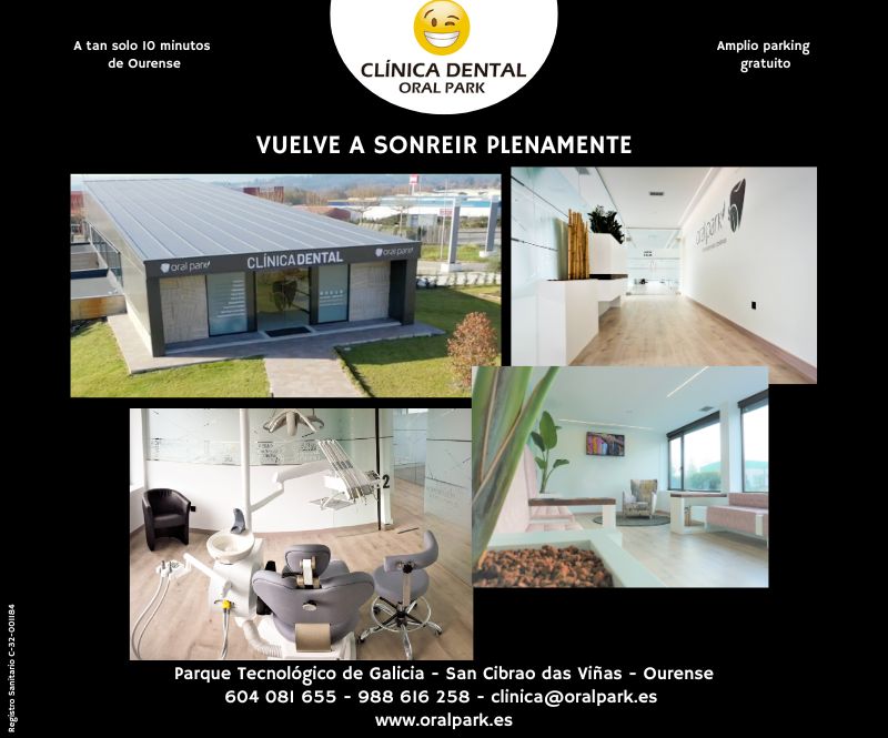 Nos encontramos AQUÍ, en el Parque Tecnológico de Galicia, Rúa de Redondela, 1, (San Cibrao das Viñas – Ourense). Si quieres ponerte en CONTACTO con nosotros puedes hacerlo en clinica@oralpark.es, o en los teléfonos 988 616 258 y 604 081 655 (Whatsapp)